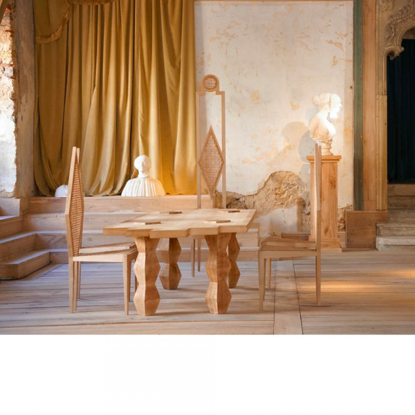 Its sculpted eucalyptus wood structure, both solid and slender, evokes the columns of an ancient edifice reinterpreted in a contemporary language.