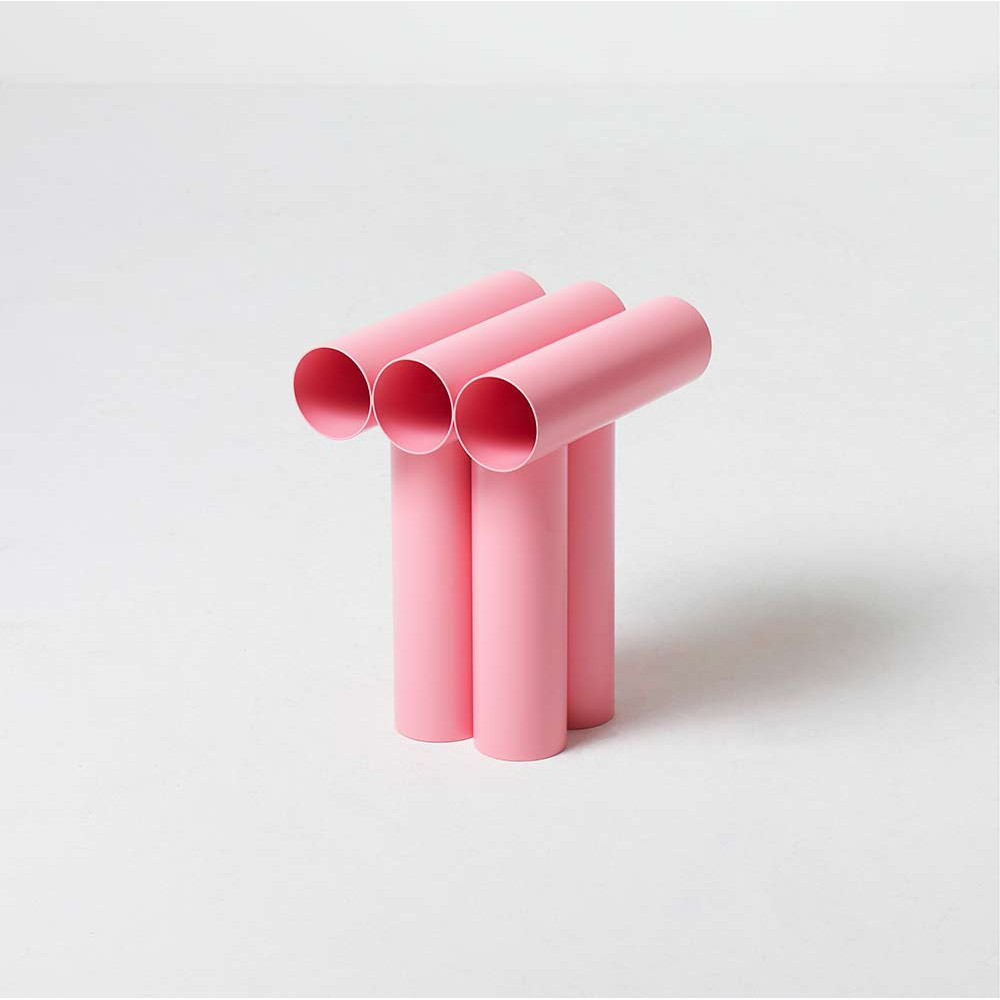 The Septem stool is made in aluminum and available in three versions: unlaquered, pink and green.