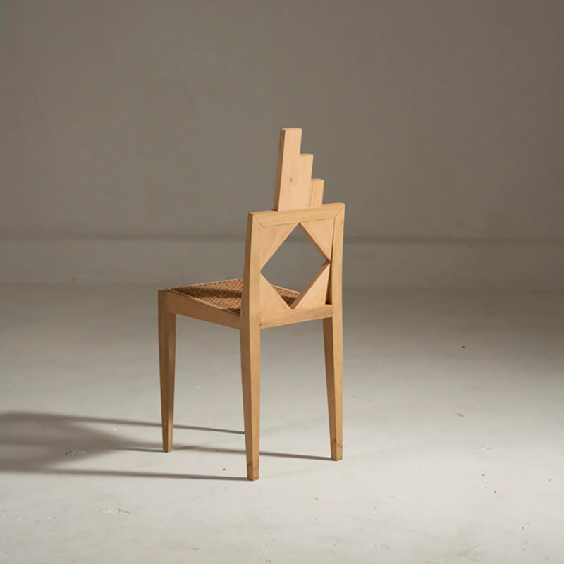 The Peões 2 Chair's tiered backrest shapes an architectural silhouette, giving it a sculptural and expressive presence. Its woven cane seat introduces softness and nuance, tempering the geometry with warmth.