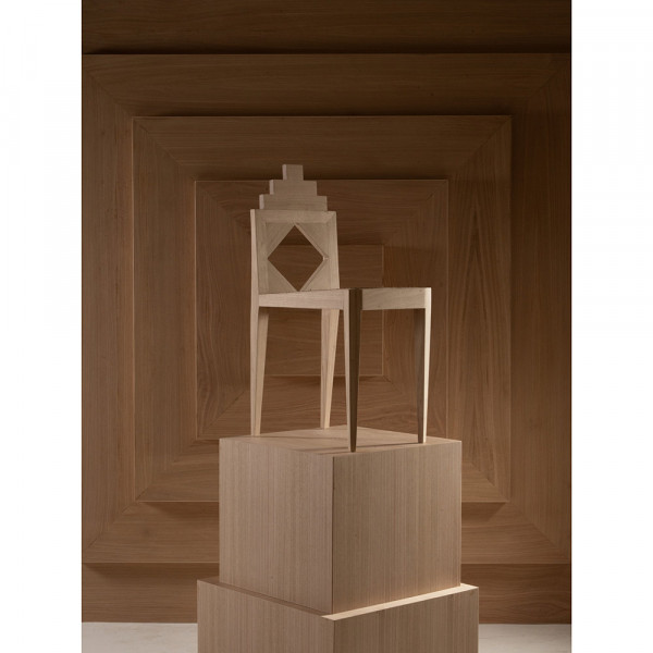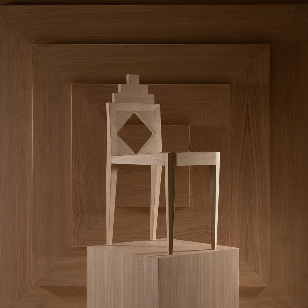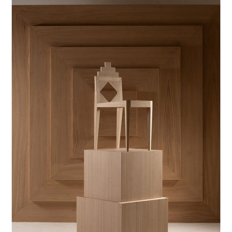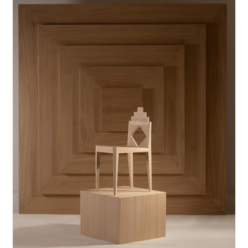 Its stepped backrest suggests an ascension, a near-totemic form, while the open square at its center introduces a sense of controlled tension.