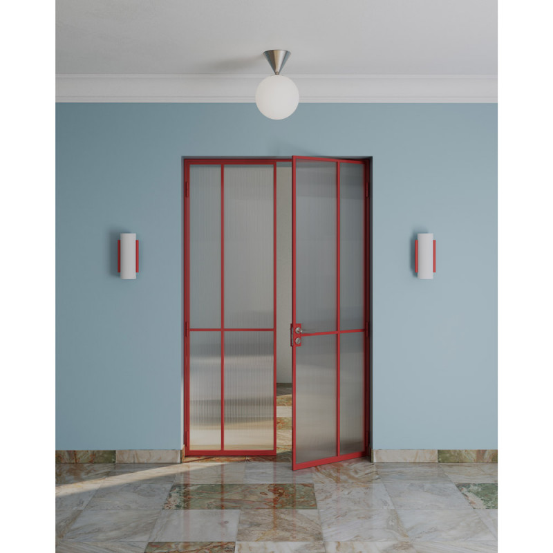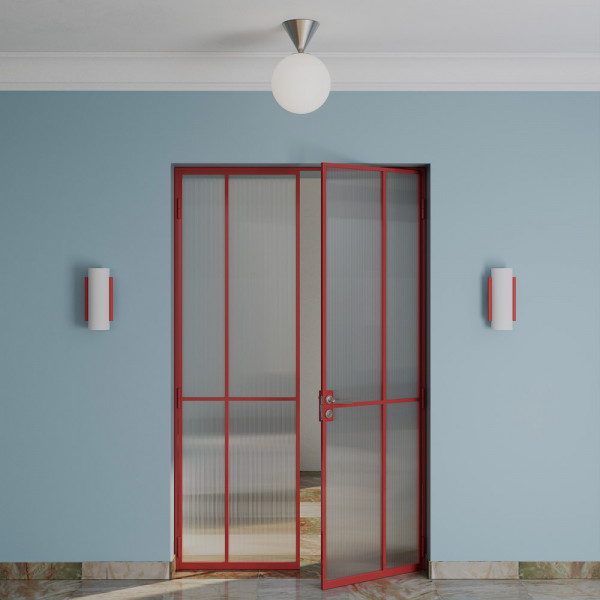 The Pion ceiling light is composed of two essential forms: an inverted cone and a sphere - a simple, almost self-evident geometry where every line finds its place. The brushed nickel or brass cone crowns a white opal glass globe. From their encounter emerges a broad, even light - perfect for structuring a space without weighing it down.