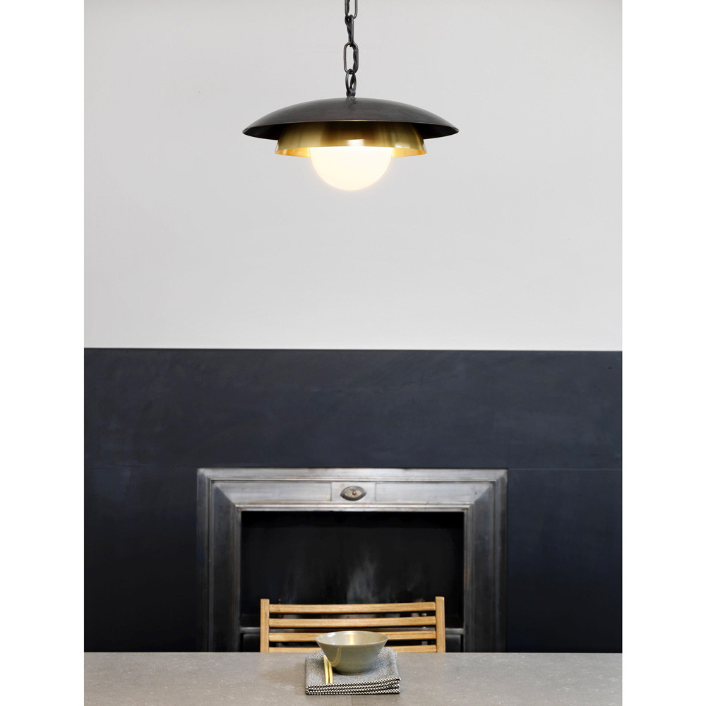The Carapace pendant is a modern re-interpretation of a 1920's light. Hand-spun metal shades are finished in bronze and brass. Holes in the brass spinning allow light to glow within the bronze spinning creating a warm glow. The opal glass diffuses the light evenly.