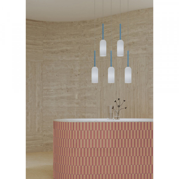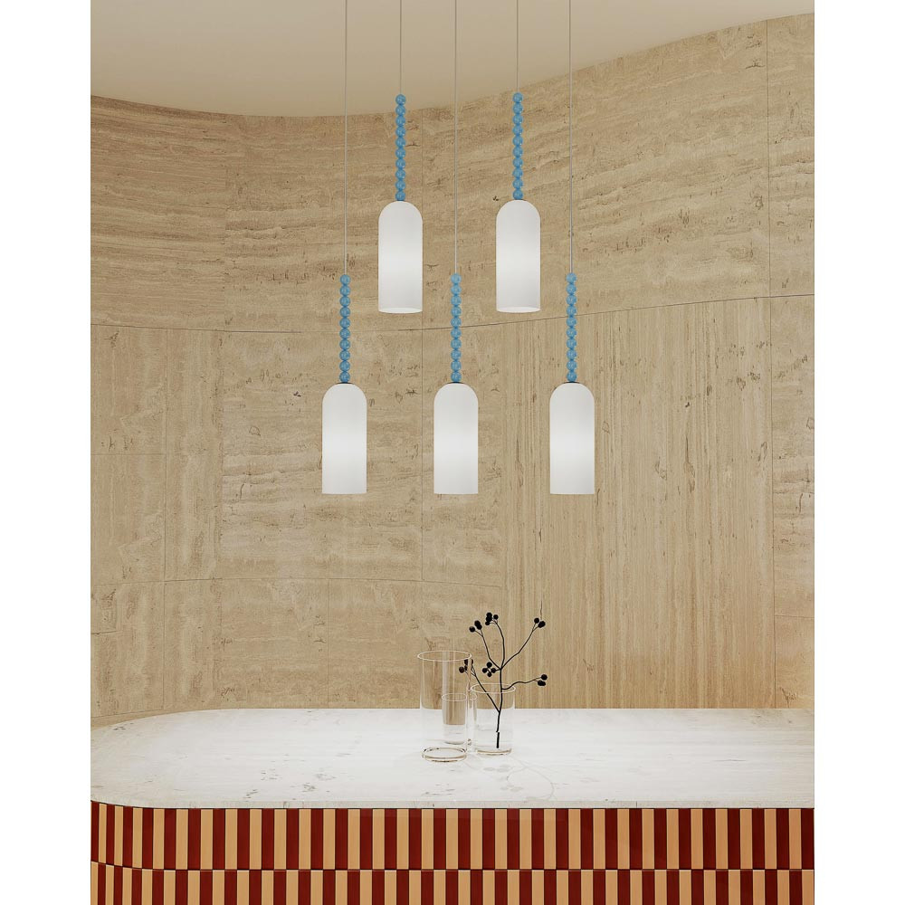 Beneath a cylindrical shade in matte opal glass, the light unfolds softly, suspended from a cord adorned with sandblasted glass beads in delicate hues. This detail - both graphic and playful - brings a sense of movement and lightness to the design’s geometric clarity.