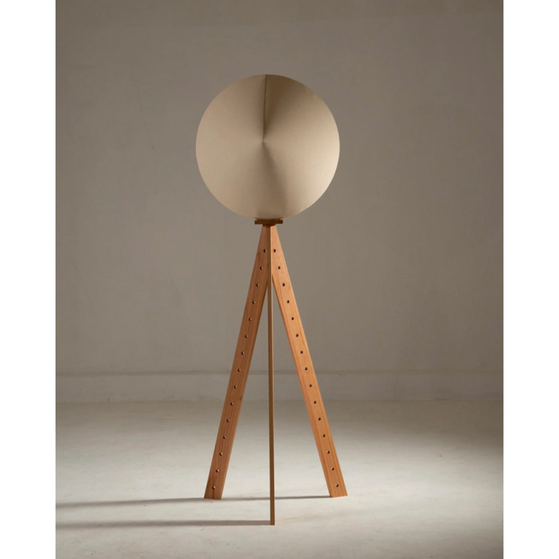 A linen cone unfolds atop a tripod structure, its perforated legs echoing the precision of technical assemblies.