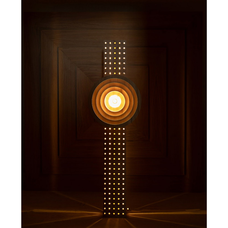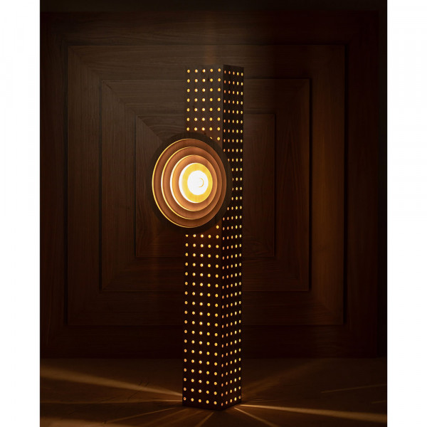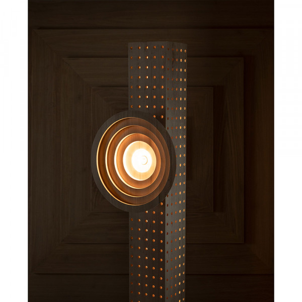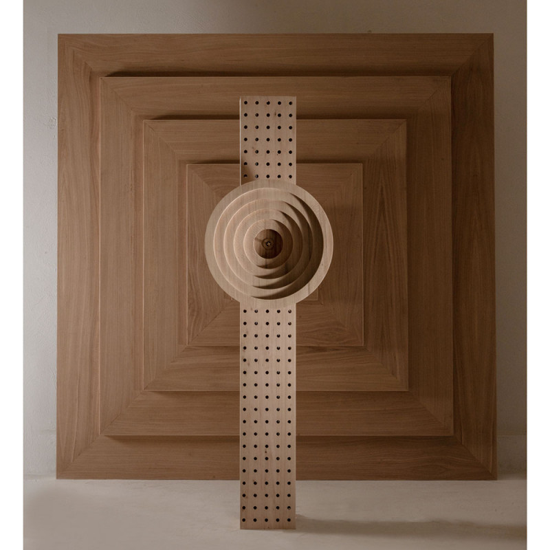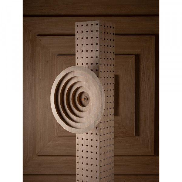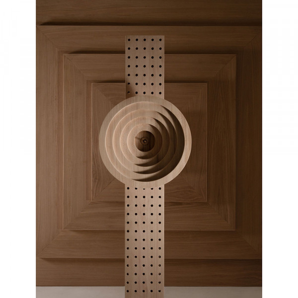 A column of eucalyptus wood, pierced with hundreds of openings, embraces a sculpted disk of concentric circles