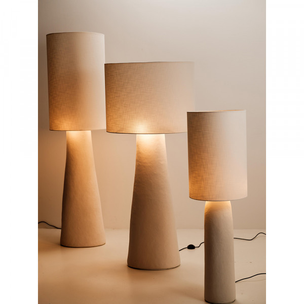 Set on the floor like a totem, it captures light as much as it emits it. Even when switched off, it remains a focal point in the room: organic, balanced, and intensely expressive.