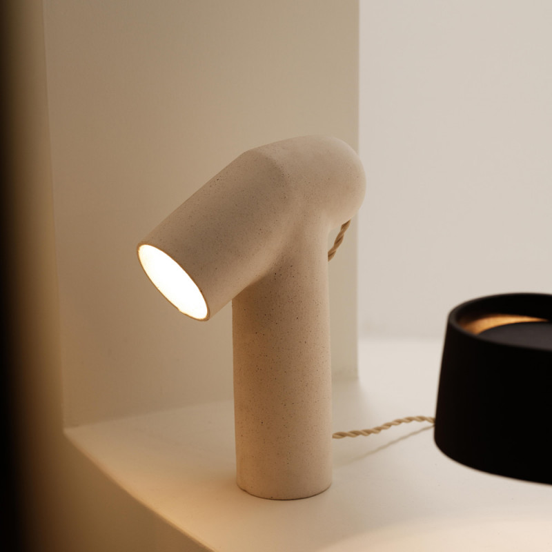 Sculpted from raw, textured stoneware, the Maia table light asserts a strong, almost primal presence.