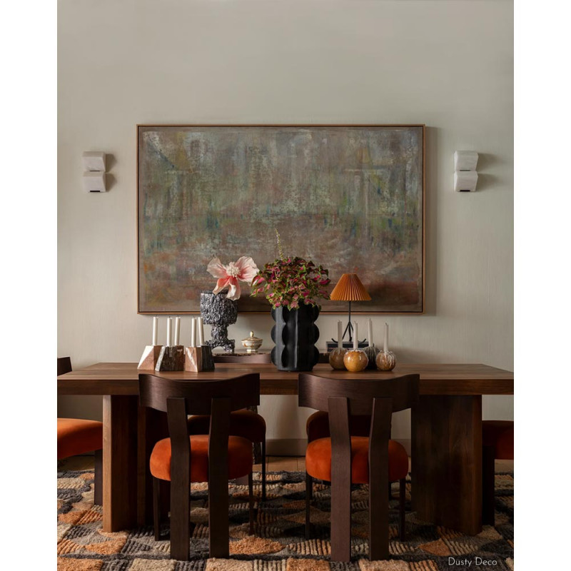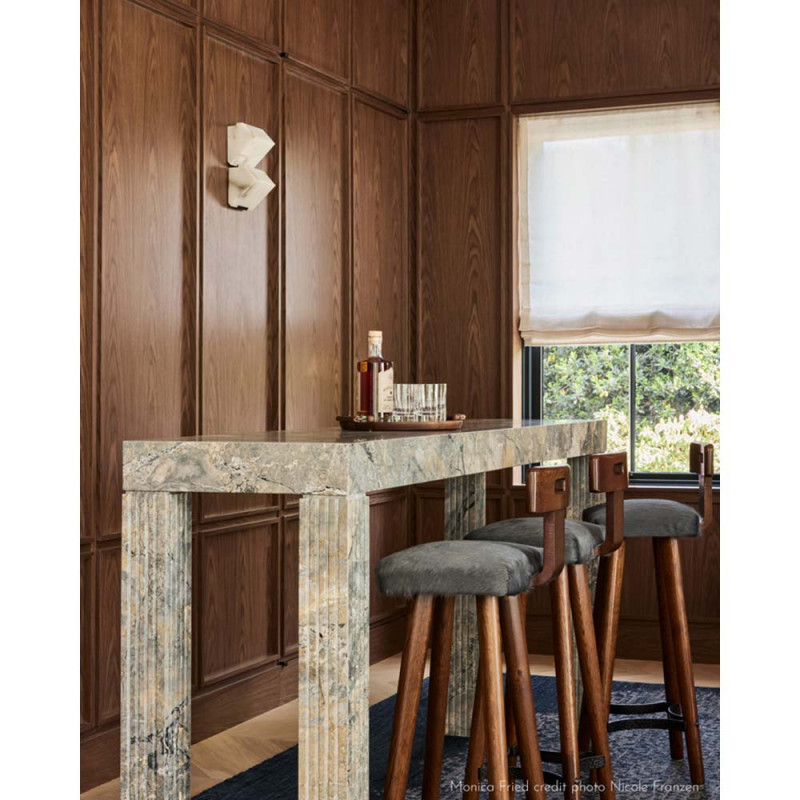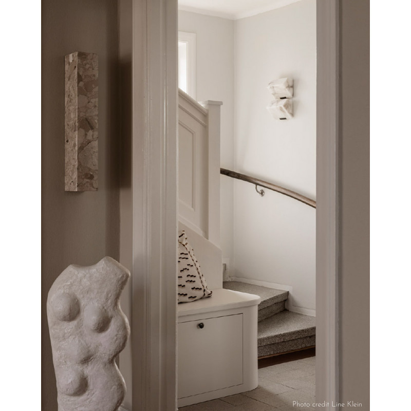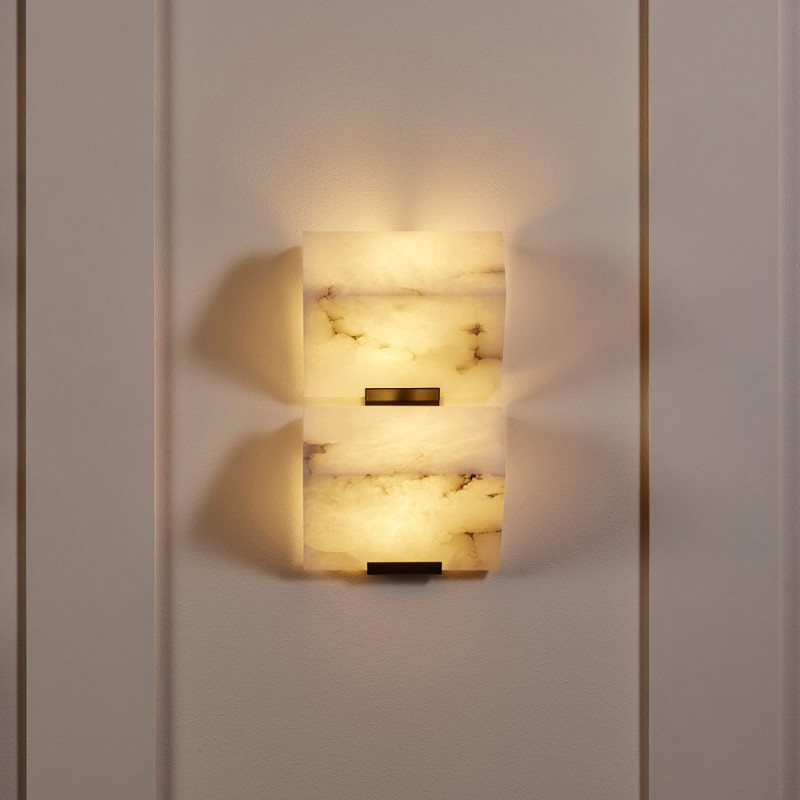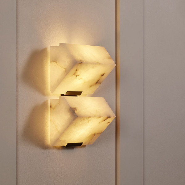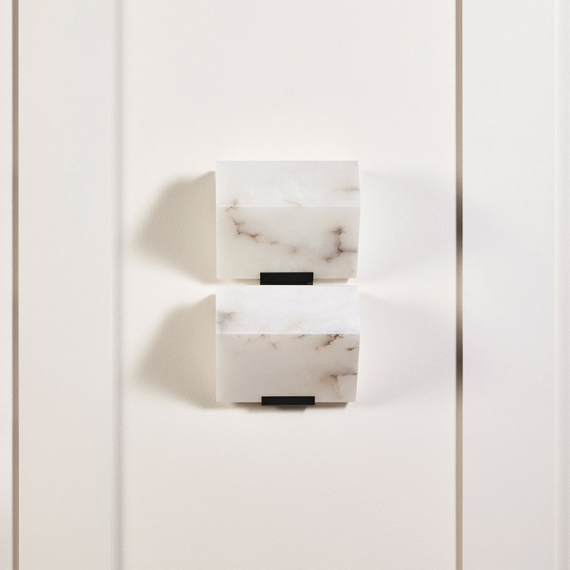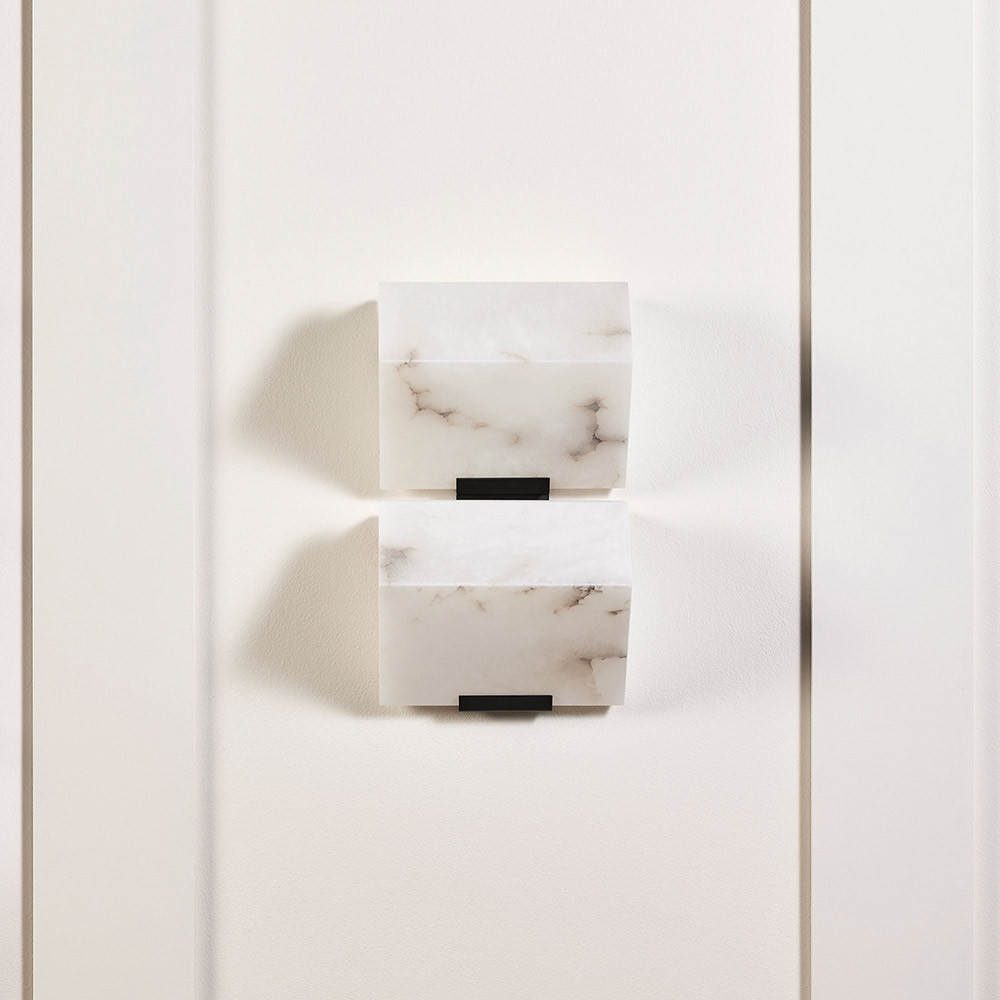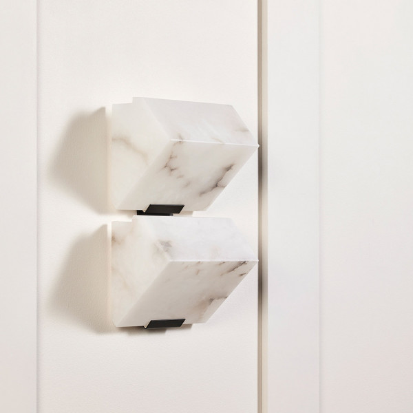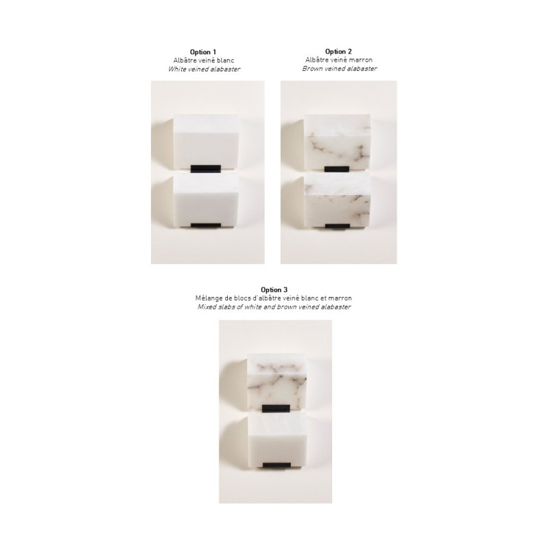 Completely covering the bulb with a triangular prism made of assembled alabaster panels, the ‘Bloc Auvent,’ created in 1923, is mounted on a black metal fixture that contrasts with the natural minerality and veining of the diffuser. The wall light is available in single, double, and triple block versions