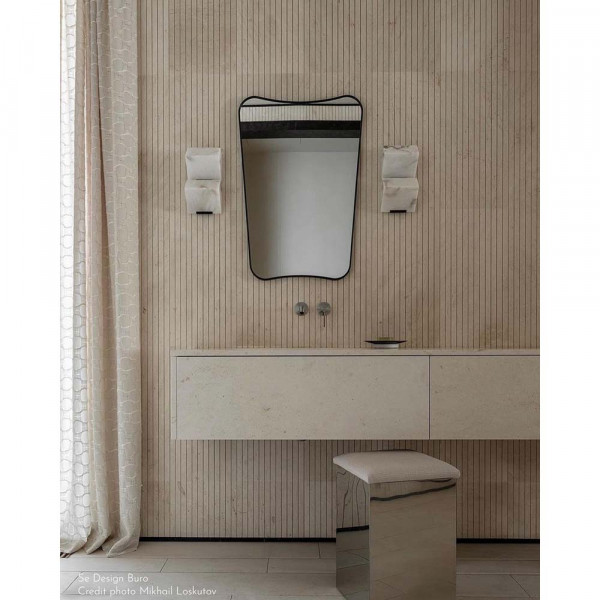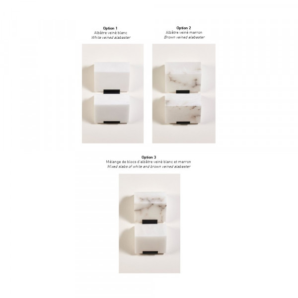 Materials : White veined alabaster, brown veined alabaster, or mixed slabs of white veined and brown veined alabaster - according to the chosen finish. Black-painted metal.