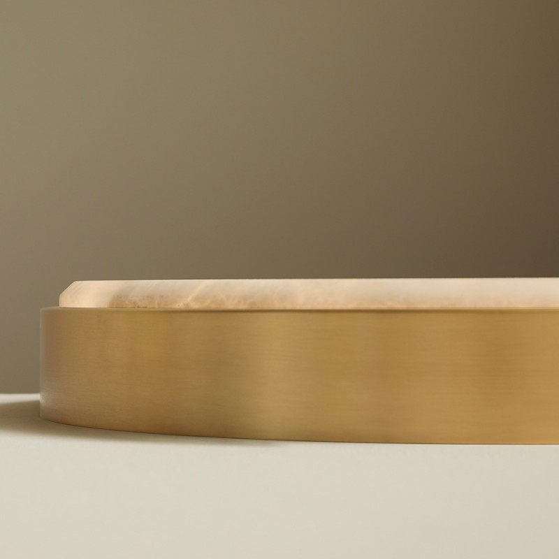 Inspired by the linear plains of the Flemish landscape, the ANVERS collection embodies the low profile of the terrain with its refined silhouette, while creating maximum impact thanks to its exquisite disc of natural alabaster stone. The translucent alabaster disc is encased in solid brass, creating a pure and elegant piece. The natural streaks inside the alabaster produce an individual and distinctive feature.