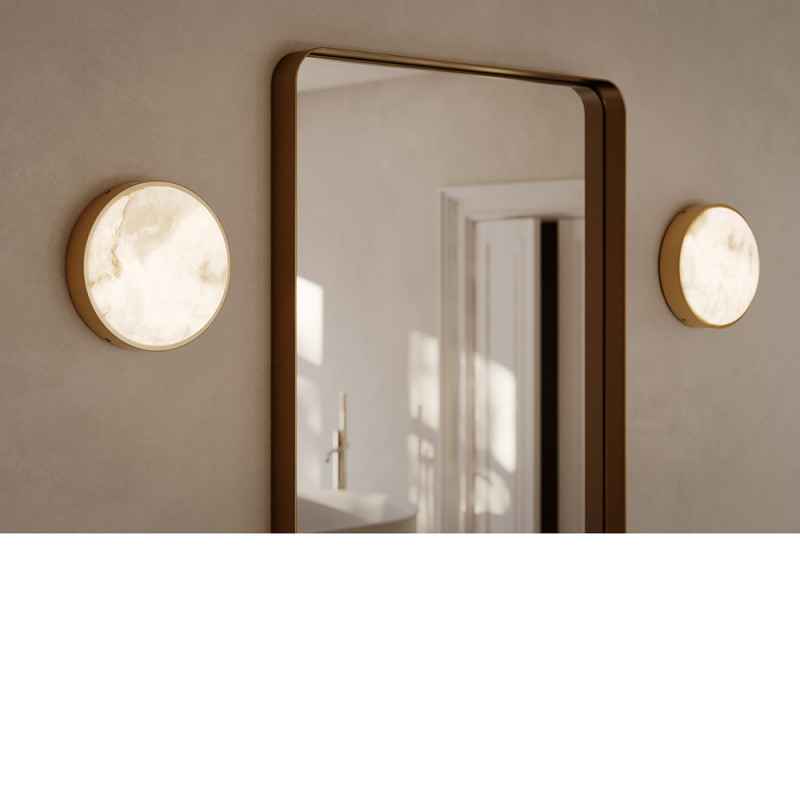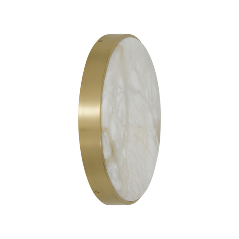 Inspired by the linear plains of the Flemish landscape, the ANVERS collection embodies the low profile of the terrain with its refined silhouette, while creating maximum impact thanks to its exquisite disc of natural alabaster stone. The translucent alabaster disc is encased in solid brass, creating a pure and elegant piece. The natural streaks inside the alabaster produce an individual and distinctive feature.