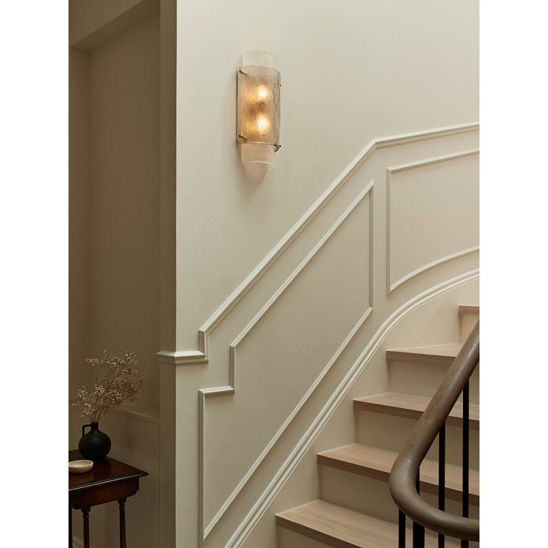The curved profile of the Dulcie wall light features two layers of textured slumped glass, catching light like the surface of water would.