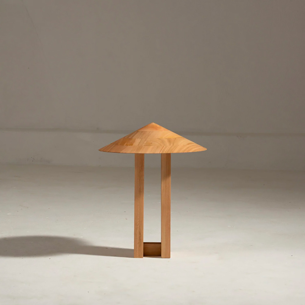 Beneath a conical shade, two vertical uprights compose an architecture reduced to its essence: a shelter for light.
