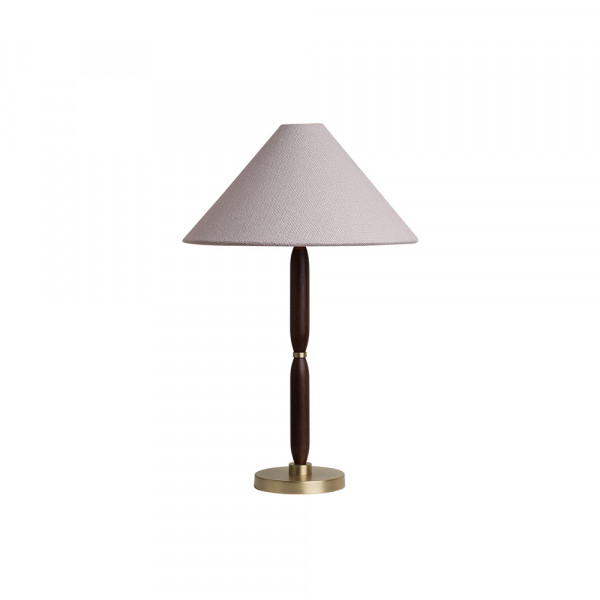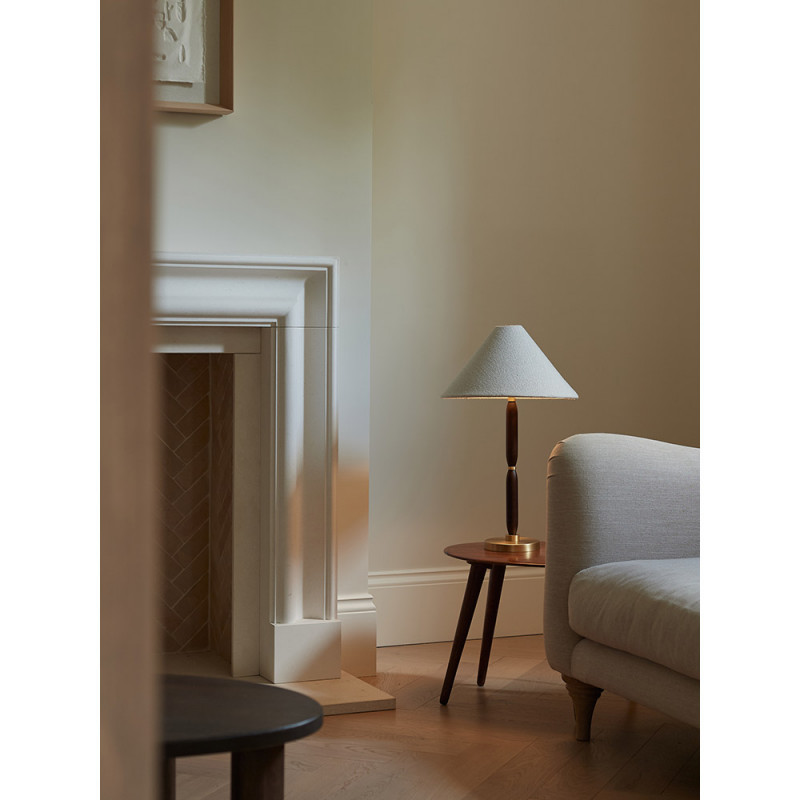 A scaled-down version of the floor lamp, the Paloma table light echoes the same poised elegance. Its hand-turned smoked oak stem is accented with satin brass and topped with a crisp conical shade.
