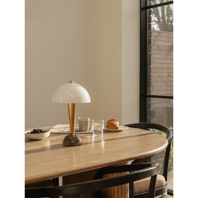Its half-sphere Emperador marble base grounds the piece with mineral richness, while the arched stem in brushed brass draws the eye upward to a soft opal glass diffuser. The ambient light evokes the quiet glow of moonlight.
