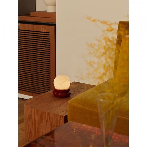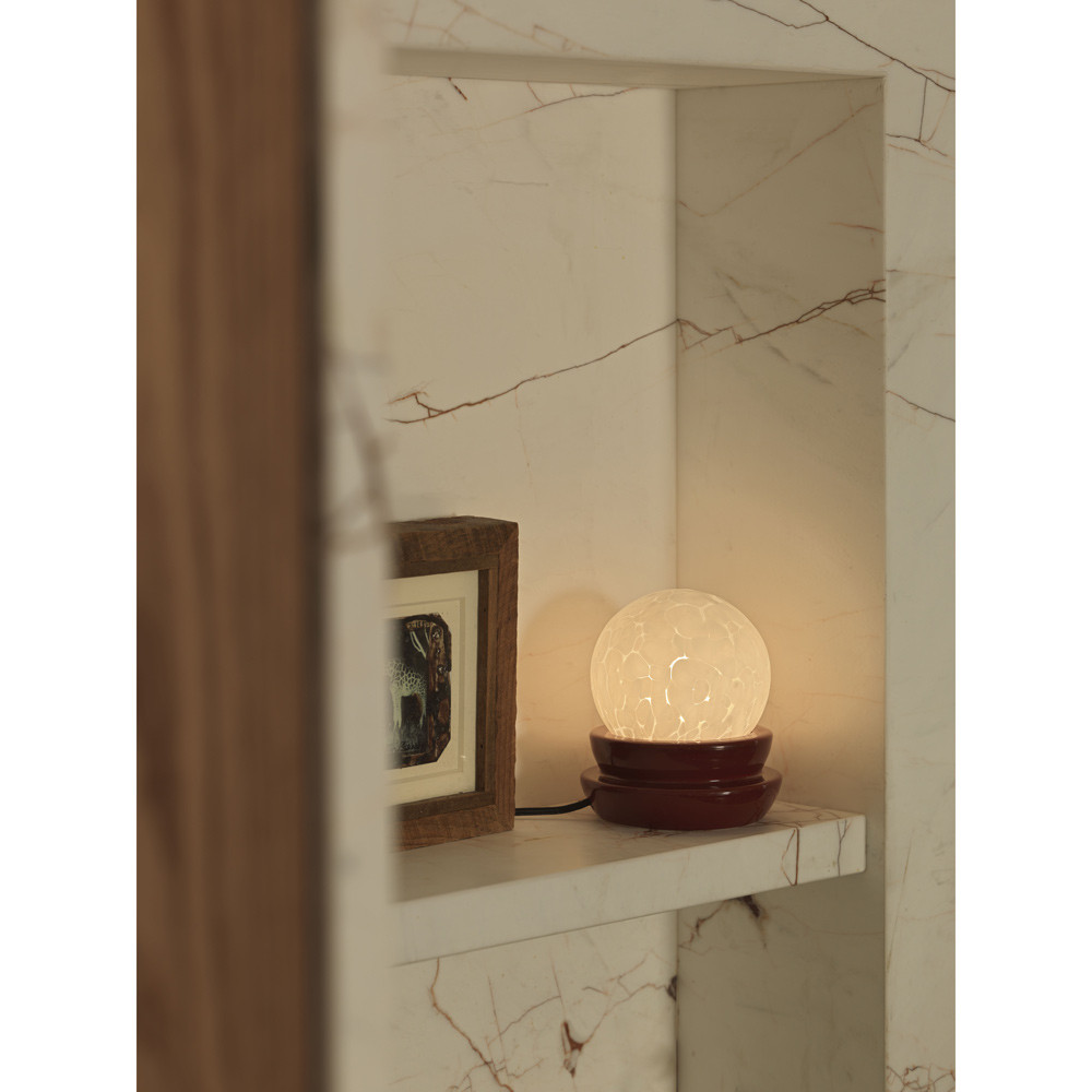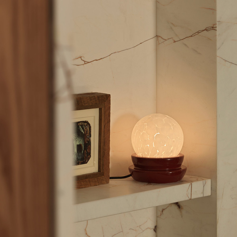 The glazed ceramic base – in red, black, or white – supports a glass globe, available in marbled white or white and coca finish, matte or glossy. Each globe is unique: artisanally made in Portugal, it reveals organic, fluid patterns - frozen in glass, never exactly the same.