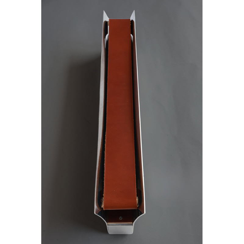 Matériaux : structure en acier inox finition brossée, habillage en cuir brun ou noir, plein ou incisé.