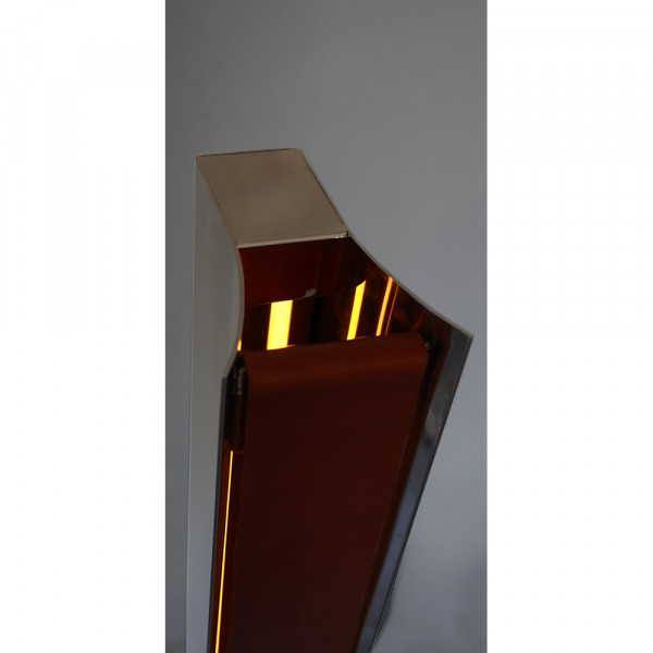 Fabriquée à la main, elle se décline en deux hauteurs : 45 et 120cm, deux coloris de peau et deux options d'éclairage : la bande de cuir centrale pouvant être incisée ou non, pour créer une ouverture centrale lumineuse.