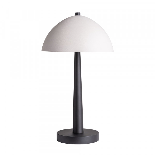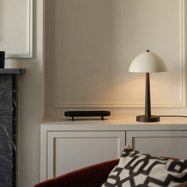 Comme une variation posée de l’applique éponyme, la lampe de table Nico décline la même silhouette affirmée : un dôme en céramique blanc, lisse et plein, posé sur une tige élancée en bronze.