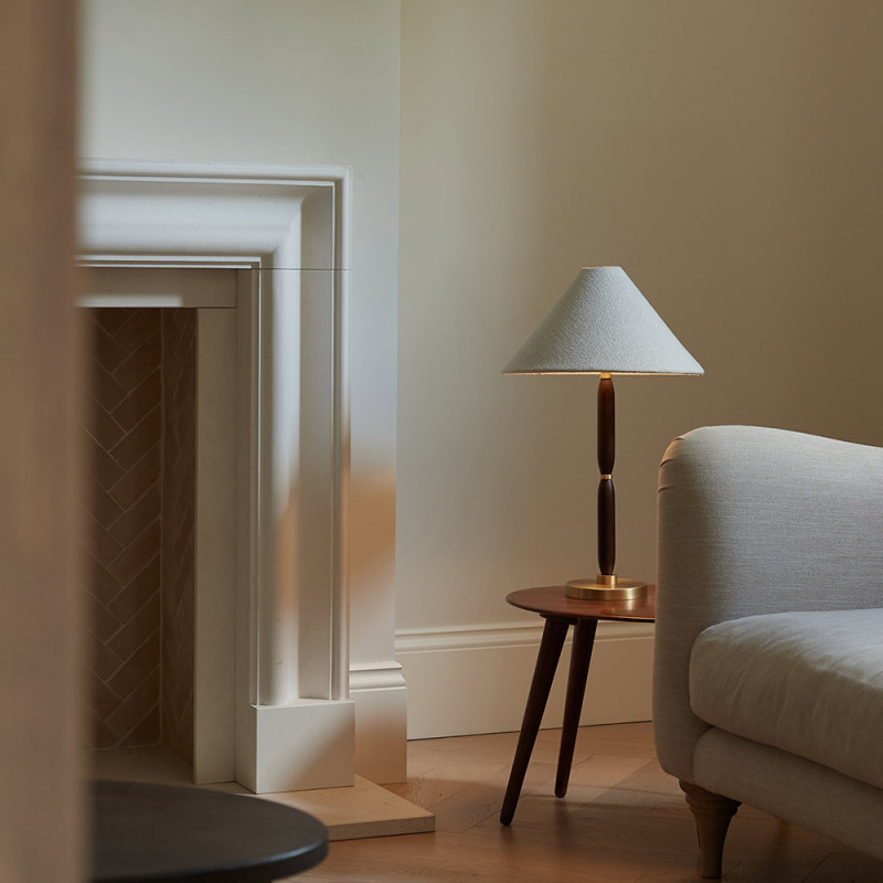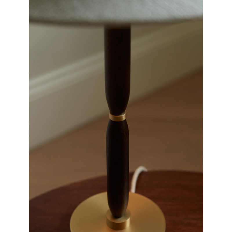 Version compacte du lampadaire éponyme, la lampe de table Paloma en reprend l’élégance sereine : un pied tourné en chêne fumé, souligné de détails en laiton satiné, surmonté d’un abat-jour conique aux lignes nettes.