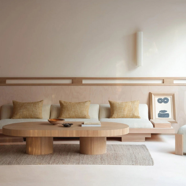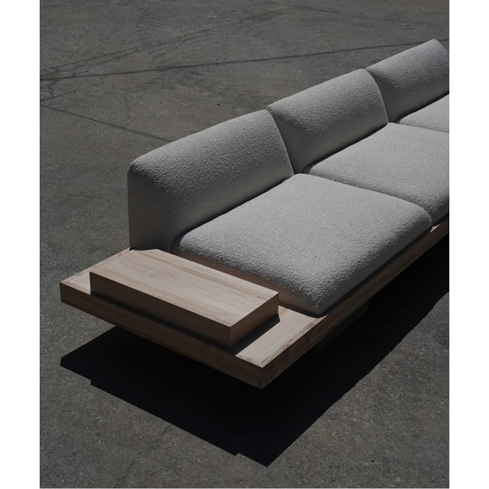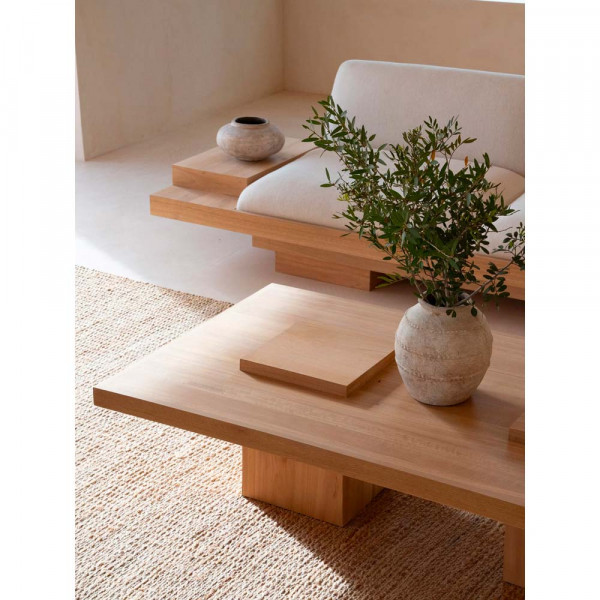 Tout y est affaire de ligne, de rythme, de proportion : un socle de bois d’eucalyptus, massif et horizontal, sur lequel repose une assise d’une sobriété absolue.