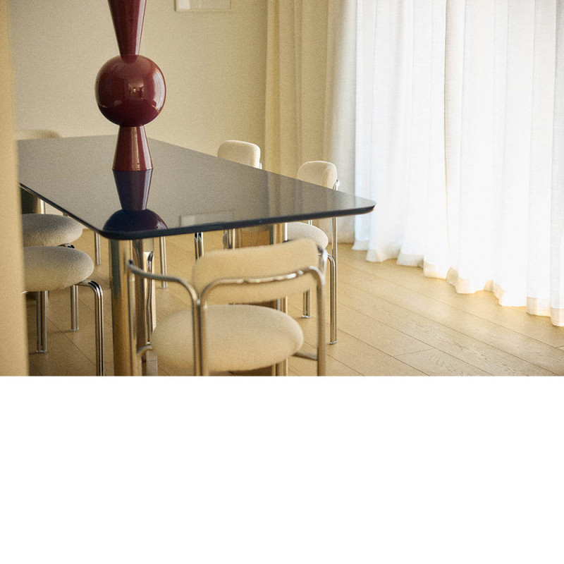 La table Pauline allie audace et élégance, réinterprétant l’esprit des années 70 avec une modernité affirmée.