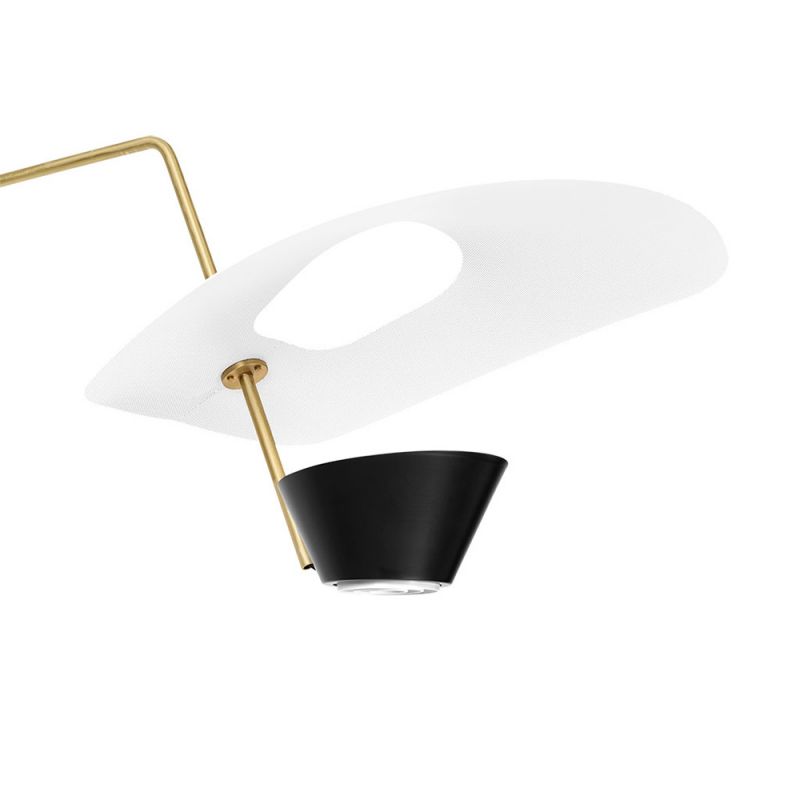 Dans sa version noire et blanche, l’applique G25, dessinée par Pierre Guariche, ne passera pas inaperçue dans votre intérieur. Elle peut s’utiliser au-dessus d’une table à manger, comme du vivant de son créateur, mais aussi dans un bureau ou une entrée grâce à ses volumes qui s’inscrivent aisément dans l’espace.