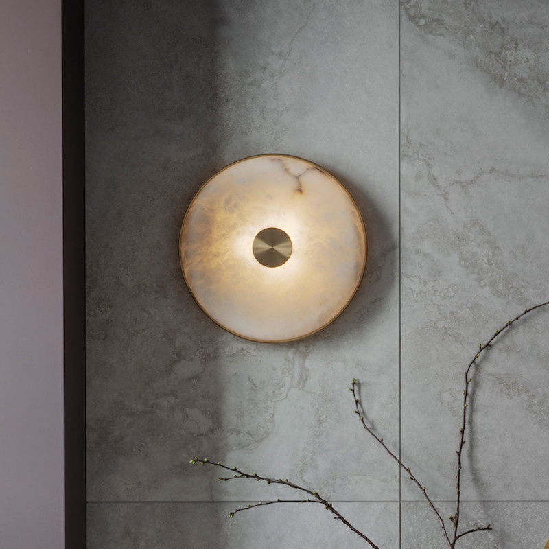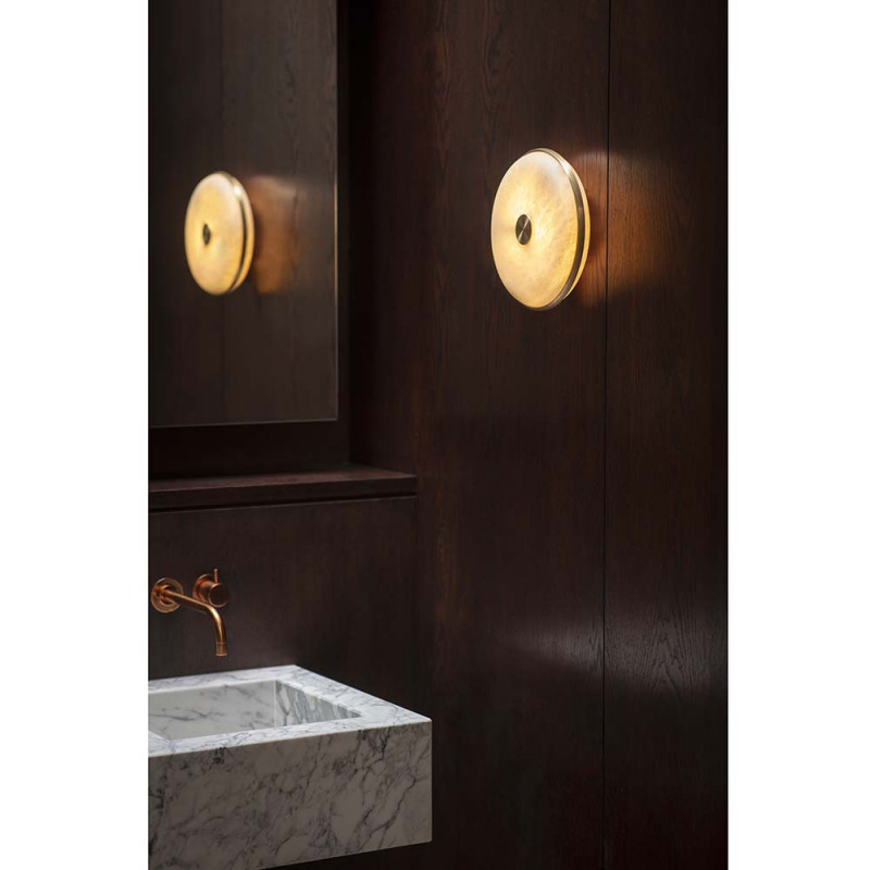 Laiton brossé usiné avec précision avec diffuseurs en albâtre naturel à l'arrière et à l'avant dans un design «coquille d'huître». Chaque pièce s'appuie sur la suivante comme support. Convient aux zones humides.