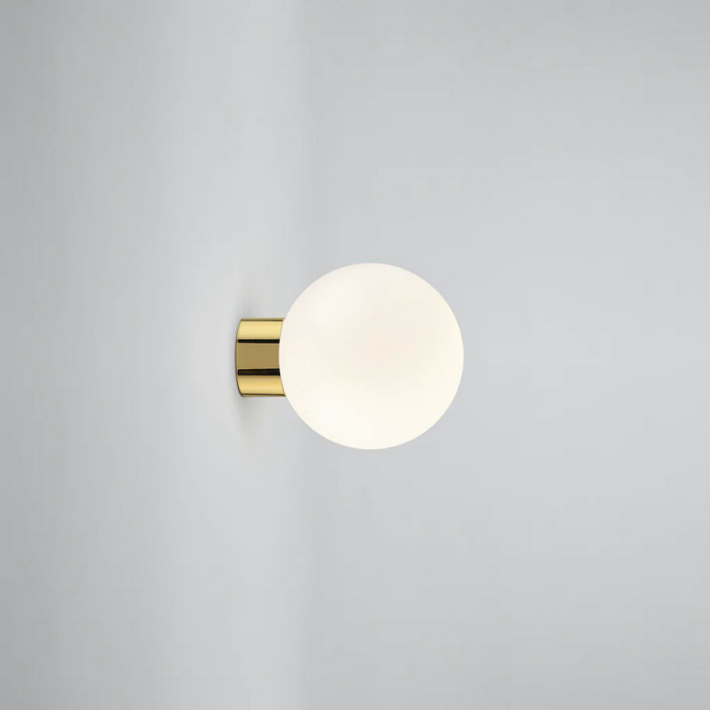 L'applique S150 est réalisée en verre opalin et est disponible en laiton poli, nickel ou laiton patiné noir.