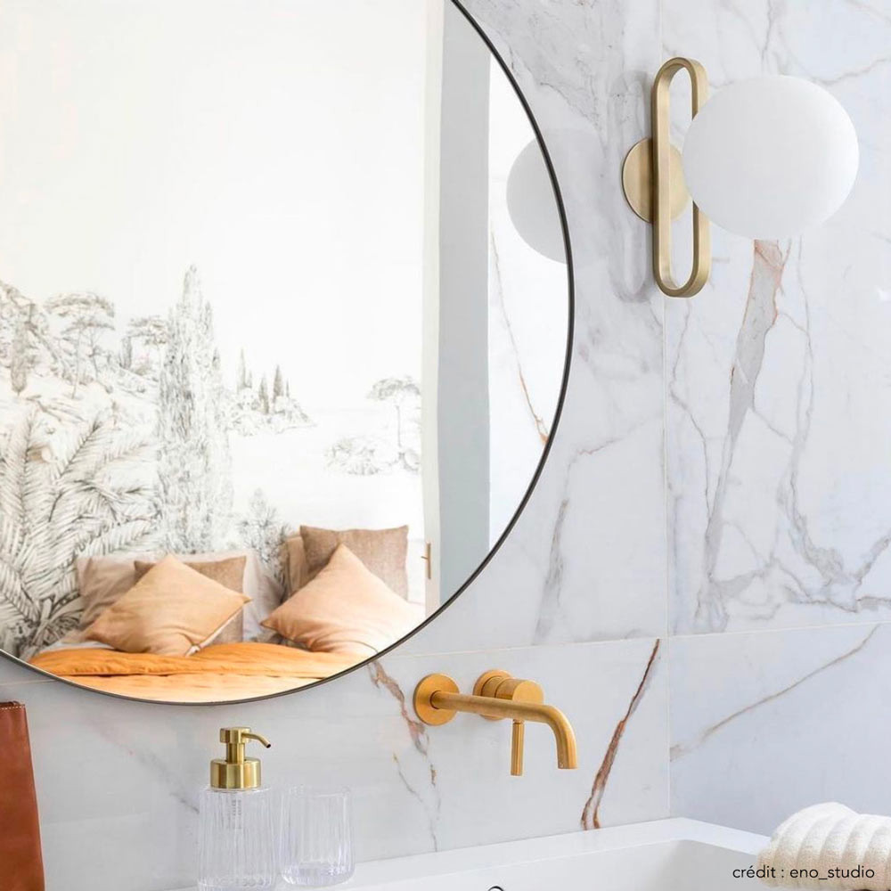 L'applique Cime est réalisée en acier laitonné doré et est disponible dans deux dimensions : globe D12cm (P20cm) ou globe D20cm (P28cm).