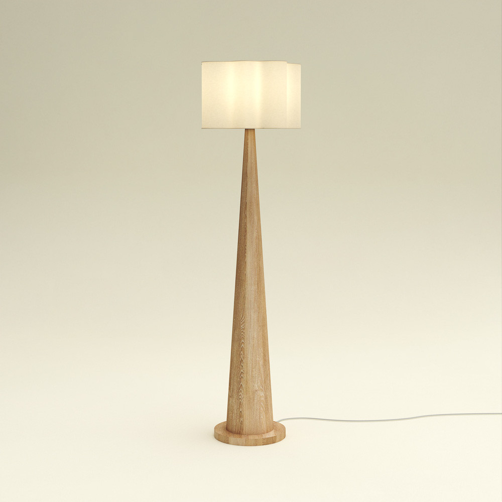 Le cône élancé en bois massif, d’une géométrie pure, contraste avec la silhouette souple et arrondie de l’abat-jour en tissu.