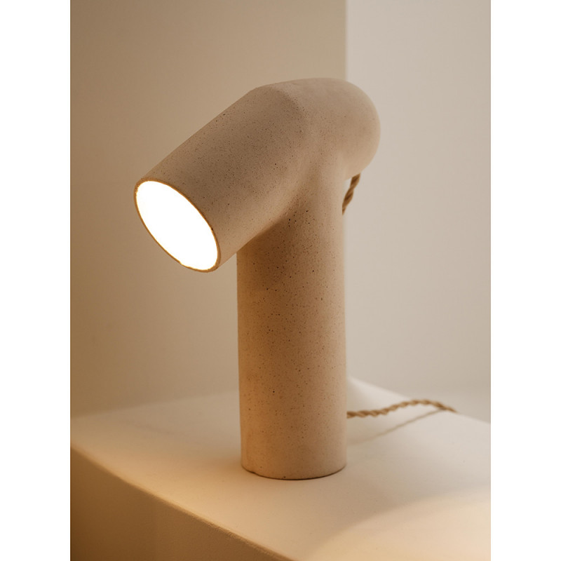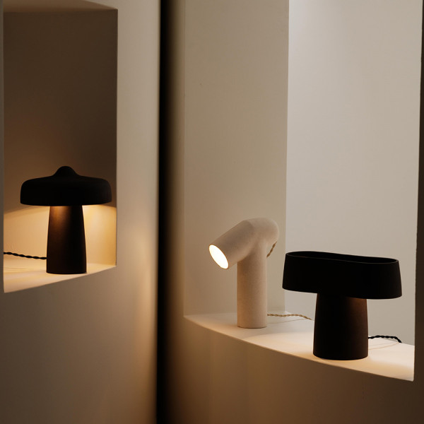 Sculptée dans un grès brute et texturé, la lampe Maia affirme une présence forte, presque primitive.