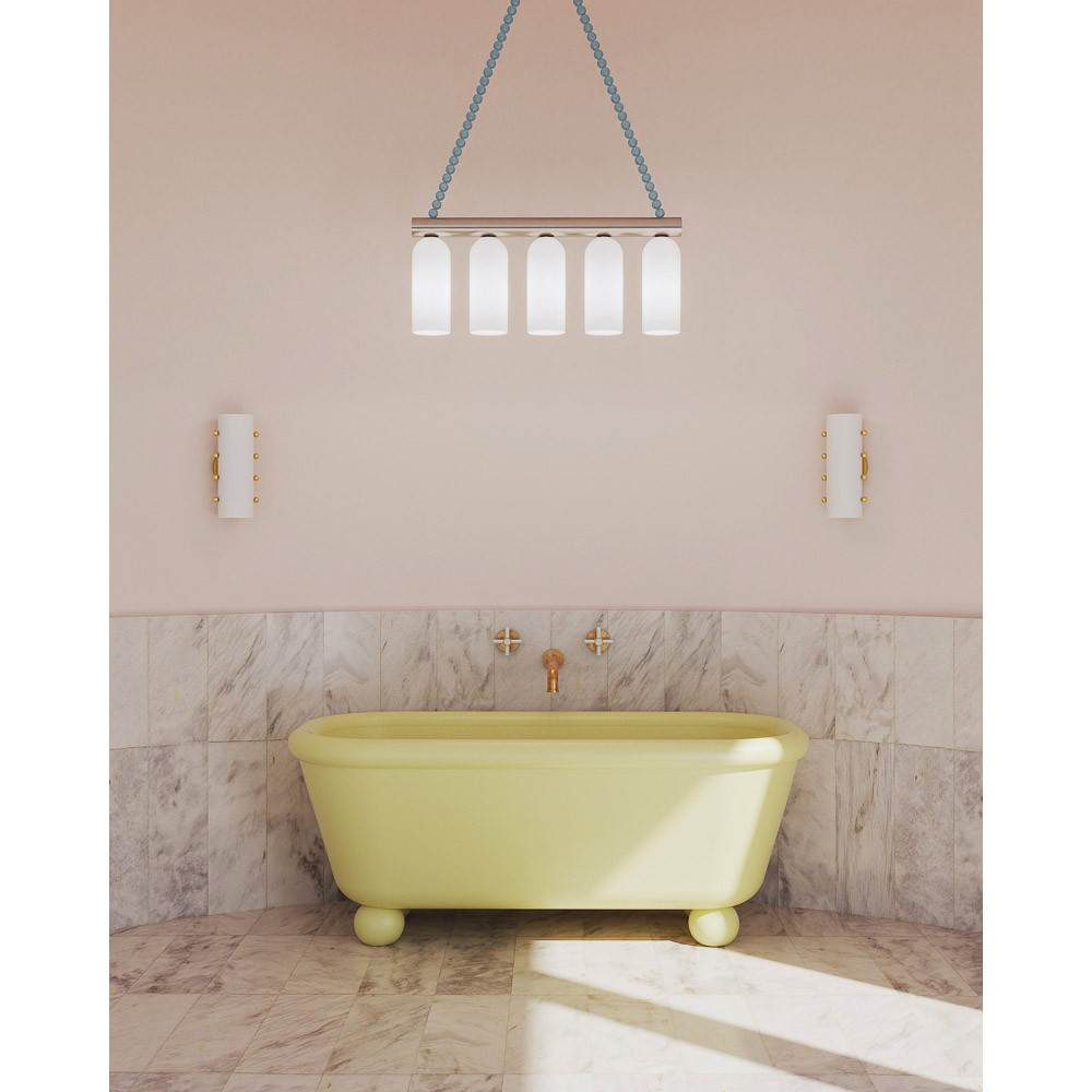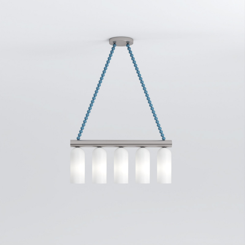 Suspendue à deux chaînes de perles de verre sablé, sa structure métallique soutient cinq cylindres en verre opalin mat - autant de modules de lumière douce, ordonnés dans une symétrie chaleureuse.