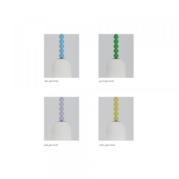 Matériaux : structure en laiton ou nickel, verre opalin mat, perles de verre sablé (bleu, vert, rose ou jaune).