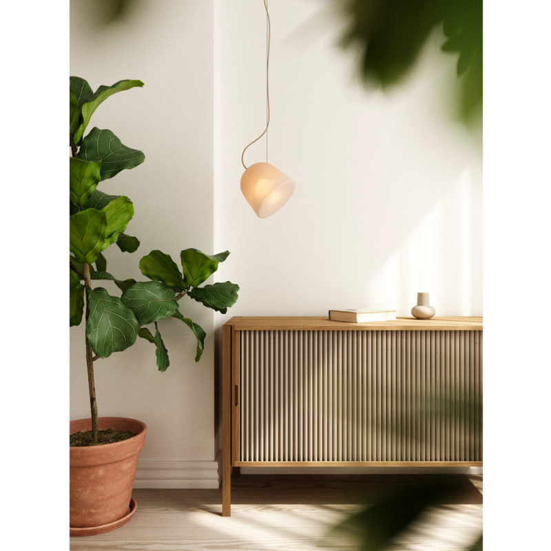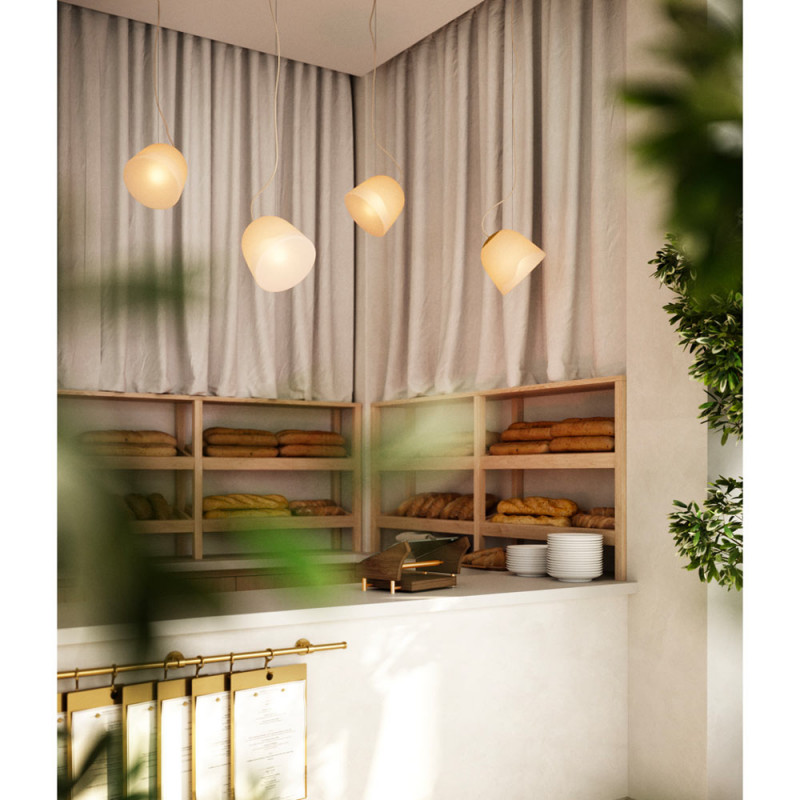 Fabriquée artisanalement, chaque suspension Breeze diffuse une lumière unique. Deux couches de verre soufflé bouche laissent filtrer une lueur chaleureuse : l’une dessine le contour extérieur, l’autre façonne un intérieur au caractère affirmé.