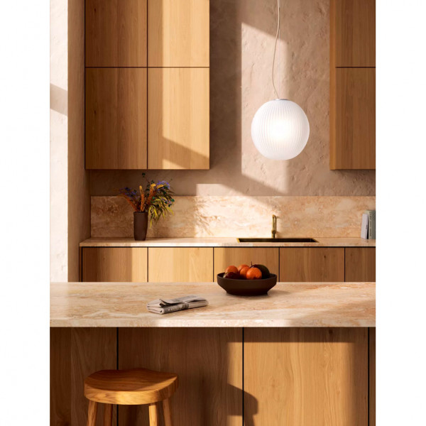 Réalisée en verre soufflé bouche, la fabrication de cette suspension rend hommage aux techniques séculaires des maîtres verriers vénitiens. Un disque en laiton coiffe le haut du globe, ajoutant du raffinement à la pièce.