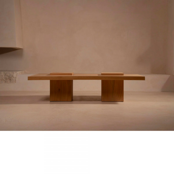 Les socles, qui prolongent la table au-delà de son propre plan, affirment sa dimension sculpturale - comme un véritable piédestal pour les objets du quotidien.