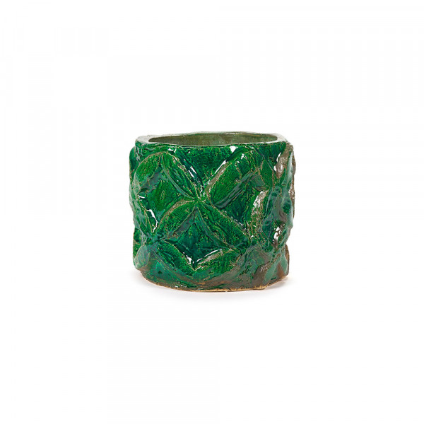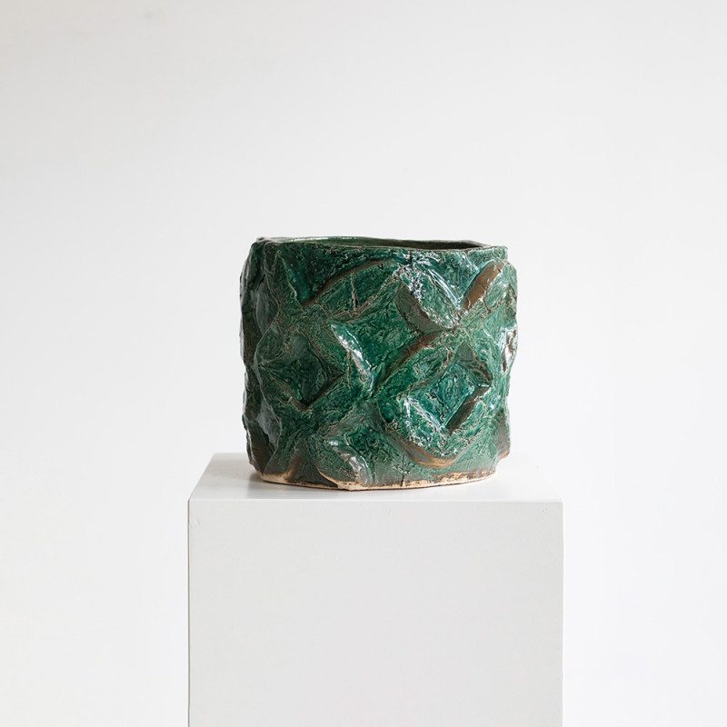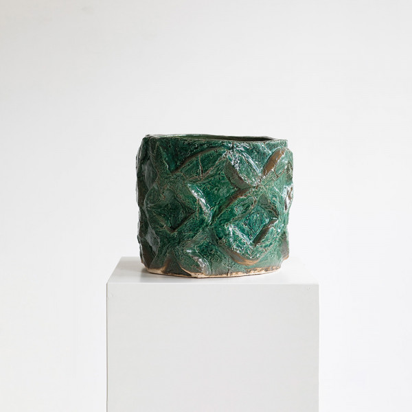 La glaçure bleue-verte, fréquente dans son œuvre, et la finition brute qui paraissent si naturelle donnent aux pots de fleurs fière allure. Simultanément, ils gardent une évidente simplicité par leur forme géométrique et leur relief répétitif.